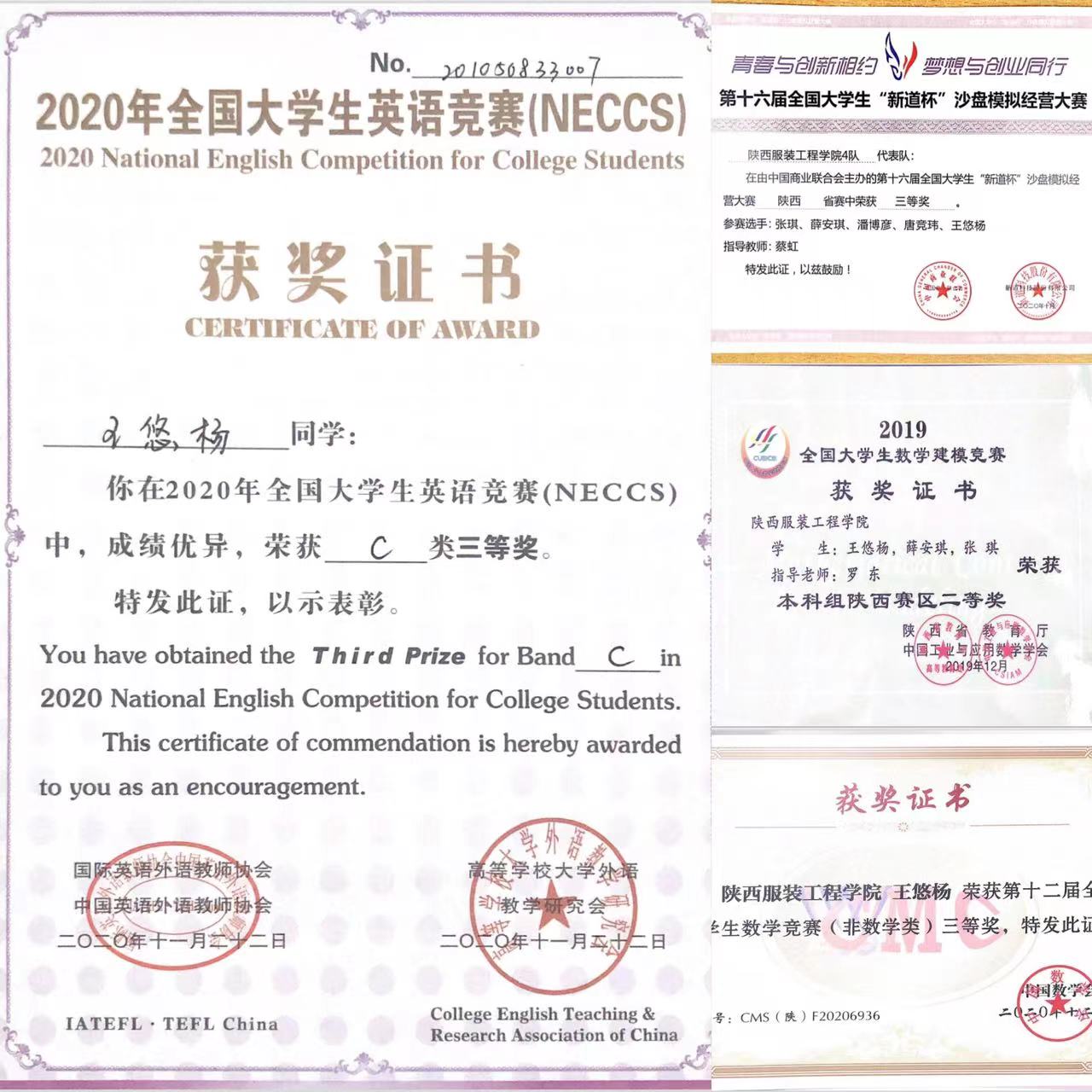 她也积极参加学校组织的各项活动,在大学生数学建模竞赛中荣获二等奖,在沙盘模拟经营大赛中荣获三等奖。她认为在大学里除了需要努力学习,也要注重实践活动,朝着全方面发展的目标而奋斗。而且参加这些活动也会成为她最为宝贵的经历,使她开阔视野,更重要的是,会培养她耐心对待每一件事的能力,提高她的做事效率。