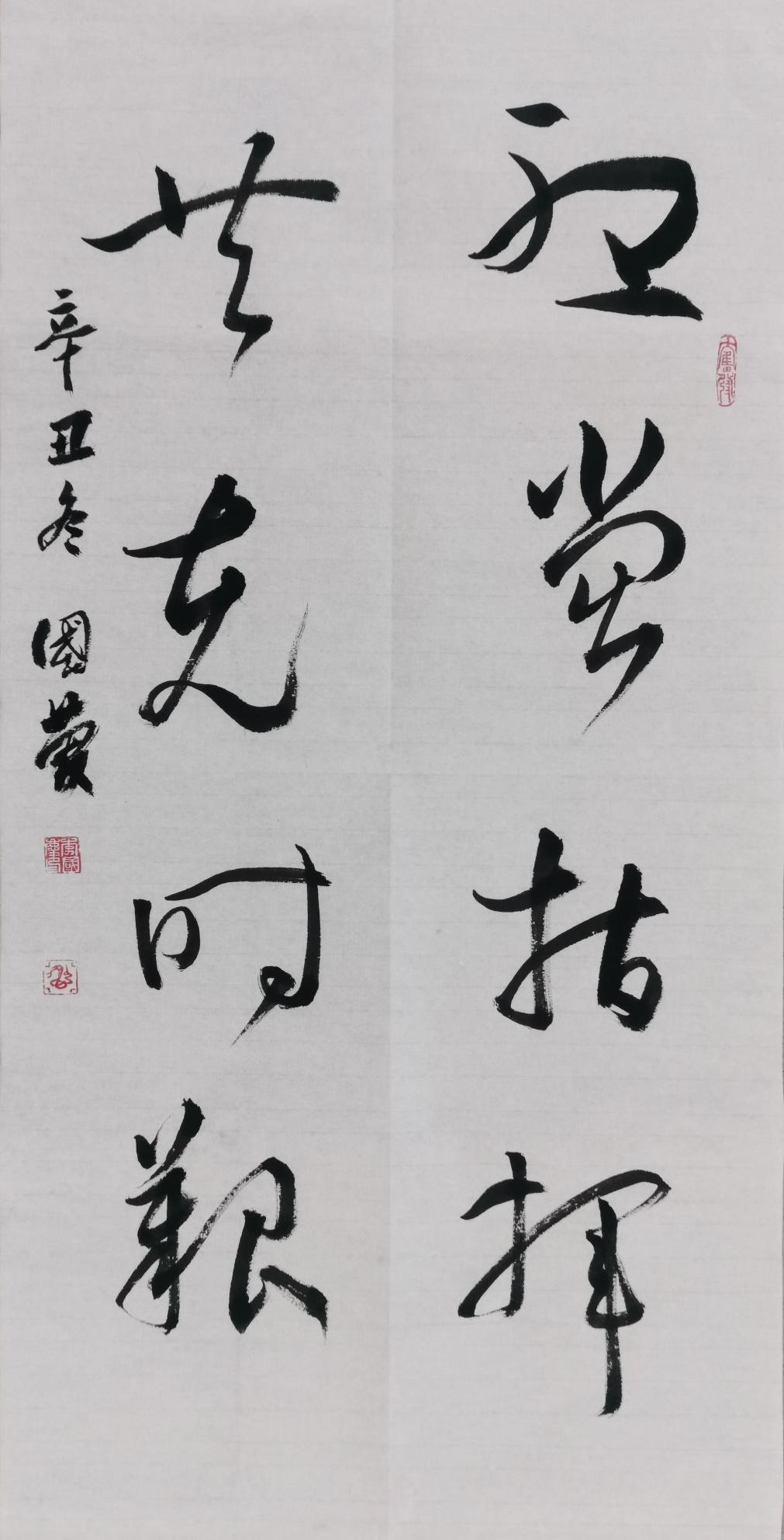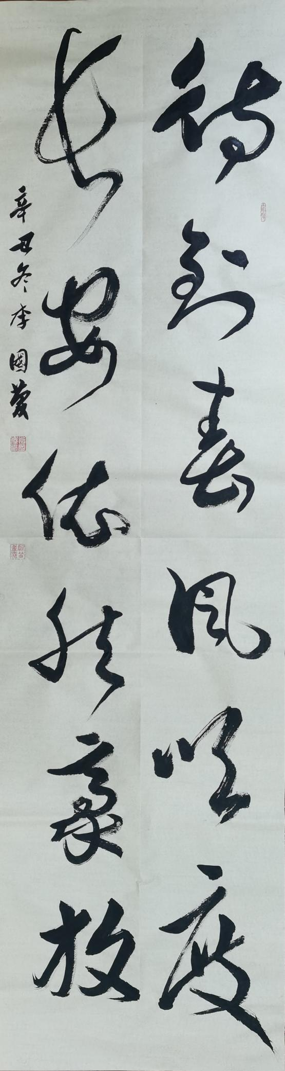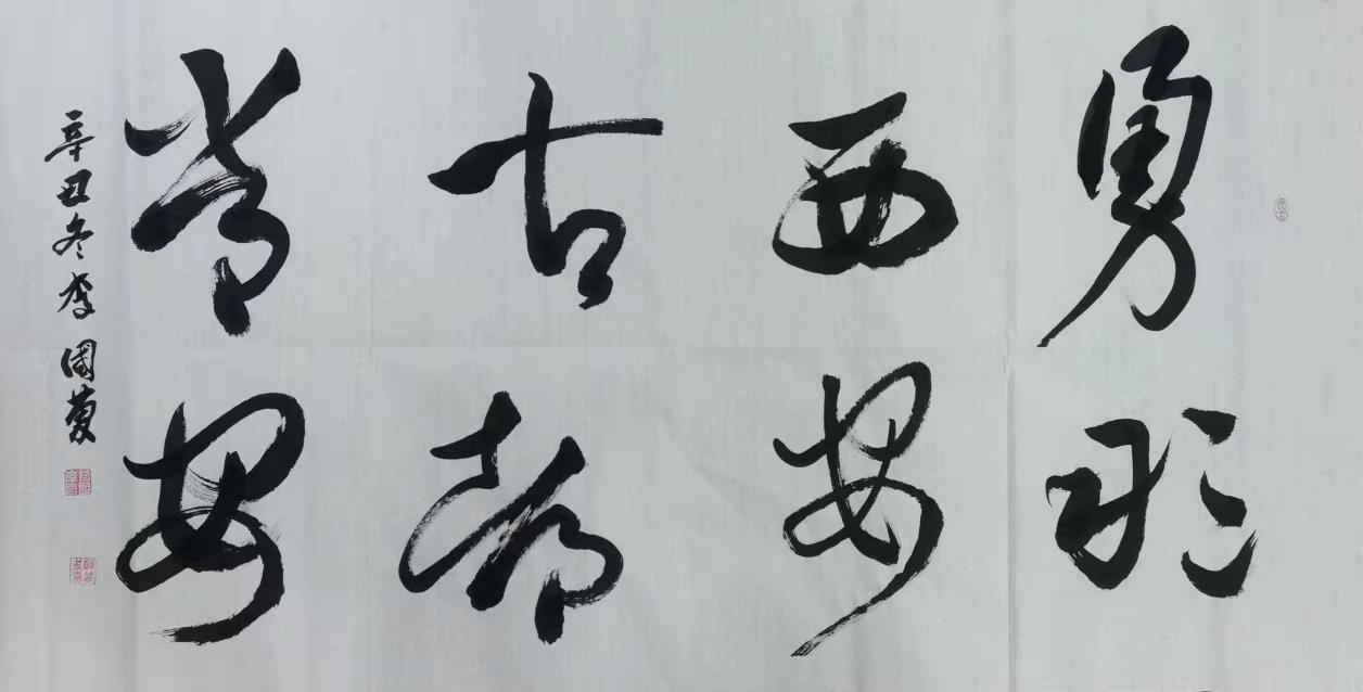 “爱是桥梁,负重前行”,这次新冠疫情防控阻击战,全城人积极配合,有市民一轮又一轮的核酸,有前线医护人员的不惧严寒,不畏病毒,还有社区工作者、志愿者,坚持守卫我们的共同家园,李国庆知道他们的担子很重,知道他们的辛勤付出,写下了这一幅字,勉励更多人,给更多的人信心与安慰。