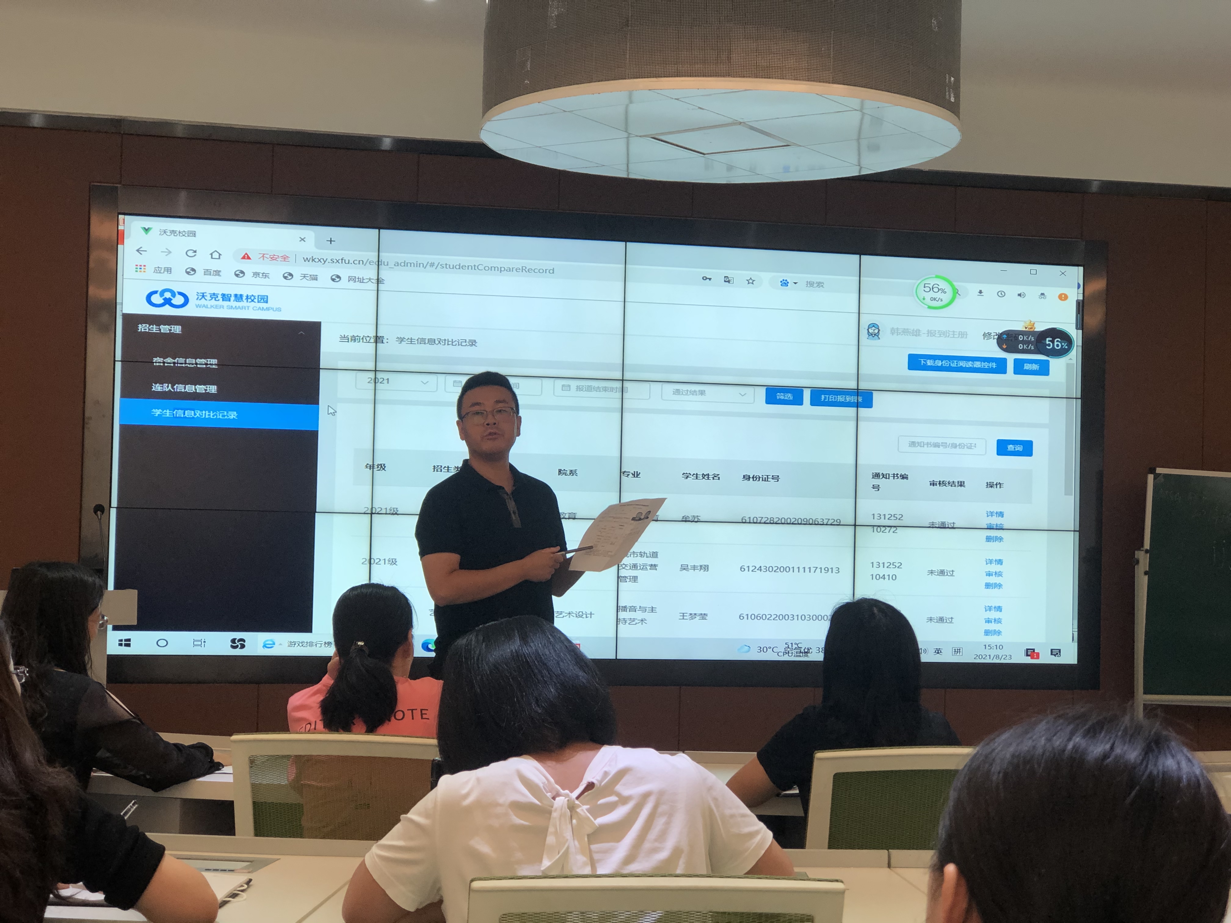 PA视讯集团副院长李玉玫解读了新生接待方案,强调到要以饱满的热情和负责任的态度为每一名新生做好服务工作,确保顺利入学。行政秘书韦瑞详细地培训了报道流程、资格审查相关注意事项。学工办主任王韬慧宣读了老生开学的时间以及接待人员的具体安排。教学秘书来燕强调:每一名接待的老师要以专业的态度做好专业解读和转专业的相关事项。