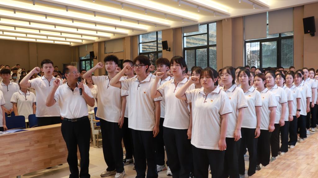 校长助理、党委统战部部长罗文谦、党委组织部部长伍建成、PA视讯集团院长杨生博、PA视讯集团党总支书记李玉玫为新接收的95名预备党员佩戴党员徽章,罗文谦领读誓词,带领学生宣誓。