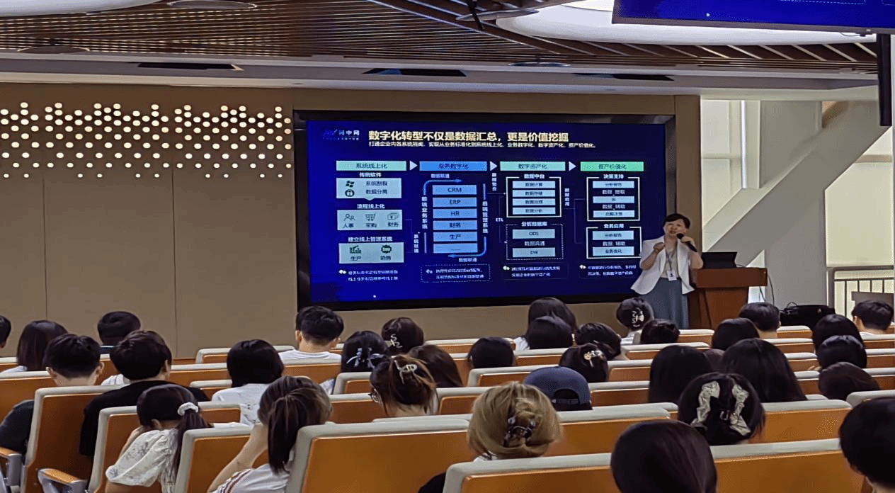 9月14日清晨,师生一行抵达网中网软件有限公司。在公司工作人员的热情接待下,大家不仅深入了解了网中网及正保教育的发展历程、企业文化与经营范围,更感受到了企业蓬勃的创新活力与深厚的技术底蕴。当日下午,由网中网软件有限公司研发总监赵静主讲的《企业数字化转型—天命人的取经之路》专题讲座,如同一场思维盛宴,深刻剖析了企业数字化转型,特别是财务领域的变革趋势,激发了学生们对未来职业发展的无限遐想与紧迫感。