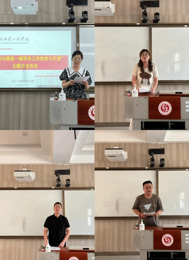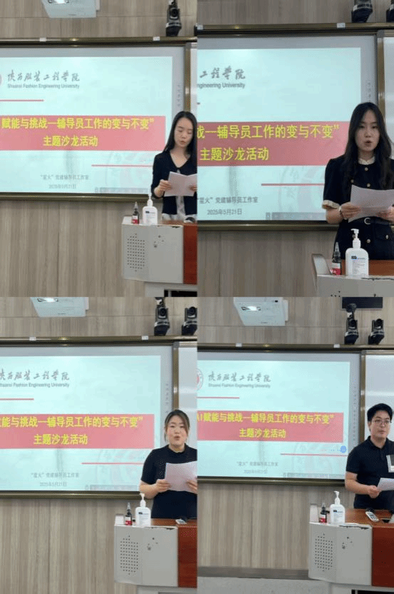 沙龙分为三个部分,第一部分:AI赋能探索者说。有6位辅导员作交流分享。5月7日- 10日,学校组织全体辅导员参加了教育部举办的线上 “全国高校辅导员人工智能专题培训班”,业界的专家为我们讲授了一堂堂的大课,让大家感叹人工智能的快速发展如此之快。随后,学工部又组织辅导员进行线上专题培训,希望大家通过再次深入的学习,为我们日后的工作提供灵感和思路。在活动的交流分享环节中,董良超谈到,在人工智能飞速发展的今天,辅导员作为学生成长的引路人,需主动拥抱技术变革,在善用AI工具提升工作效率的同时,坚守立德树人的核心使命。他强调,“变”是适应时代的方法论,开展工作的深度和广度,“不变”是教育者的初心与情怀,用心服务学生的温度不能变,二者需有机融合。随后,王韬慧,葛林艳老师谈到辅导员需要紧跟时代站在AI风口,更要修炼内功掌握新知识,崔凡老师结合共青团的工作,在开展学生思想引领和团学活动的组织方面,谈了自己的感触。薛垚、霍知谦老师也提到要积极探索AI在心理健康工作中的应用,坚守育人初心,发挥人文关怀优势。
