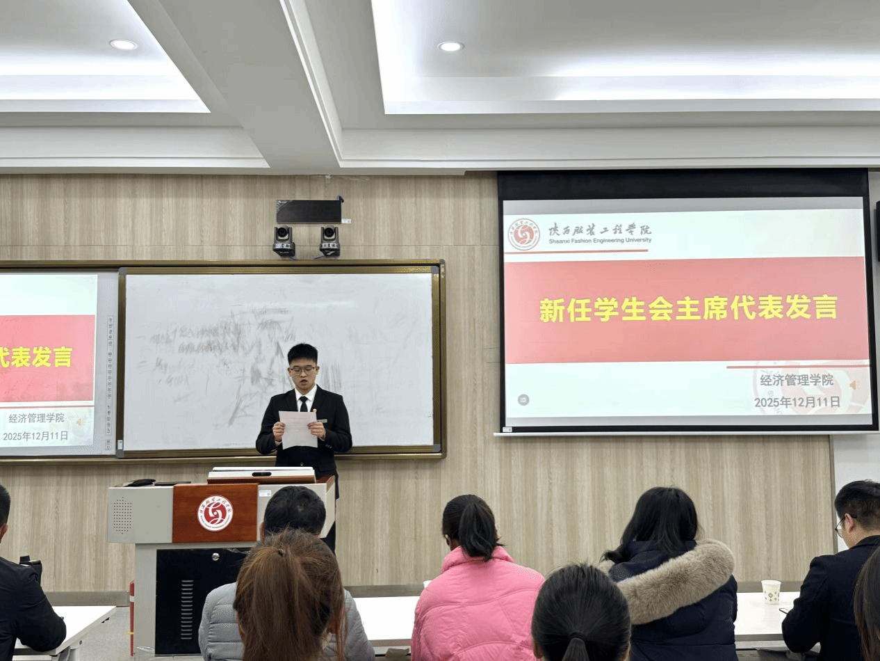 随后,新任学生会主席罗彦翔发言,他首先向关心支持学生会工作的领导老师、并肩作战的成员及信任支持的全体同学致以诚挚感谢,随后全面回顾了过去一年在“校园文化艺术节”“学风建设月”、迎新志愿服务、权益服务等工作中的丰硕成果,坦诚剖析了活动与同学需求贴合度不足、部门协作效率待提升、服务覆盖面与精准度需加强等短板,最后寄语新一届成员牢记“服务同学、奉献校园”初心,传承优良传统、勇于创新突破,在倾听同学心声、践行责任担当中锤炼自我,为校园建设贡献青春力量。