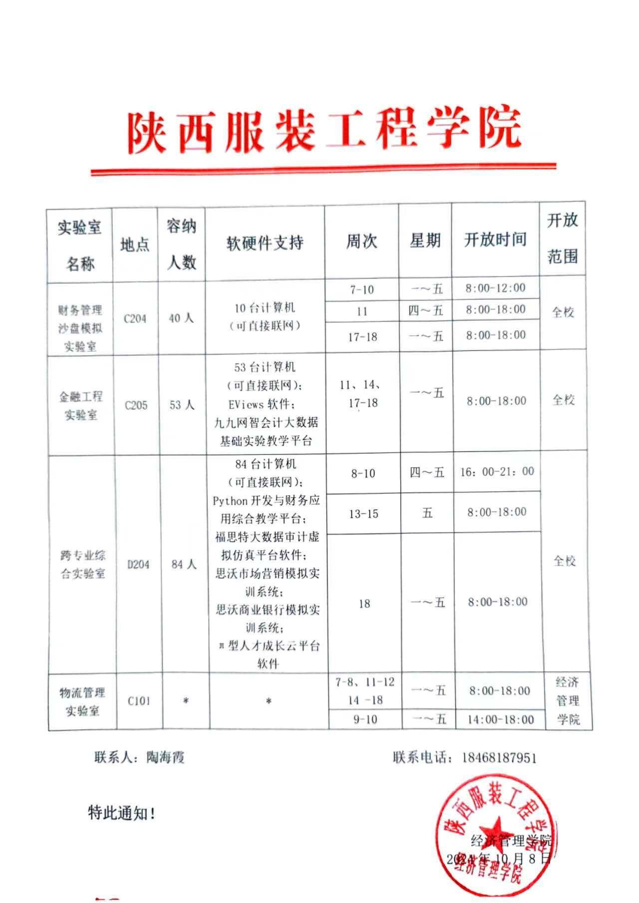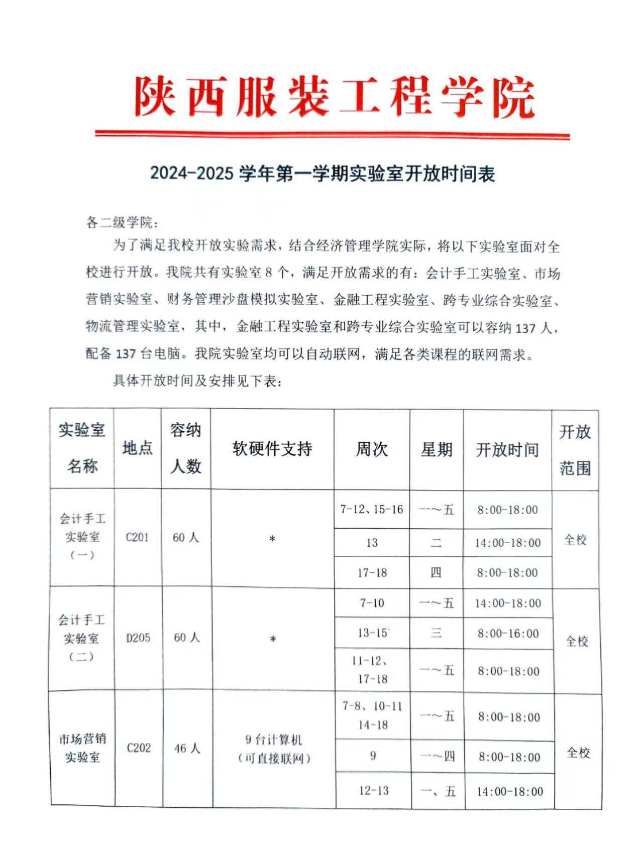 2024—2025学年第一学期实验室开放时间表