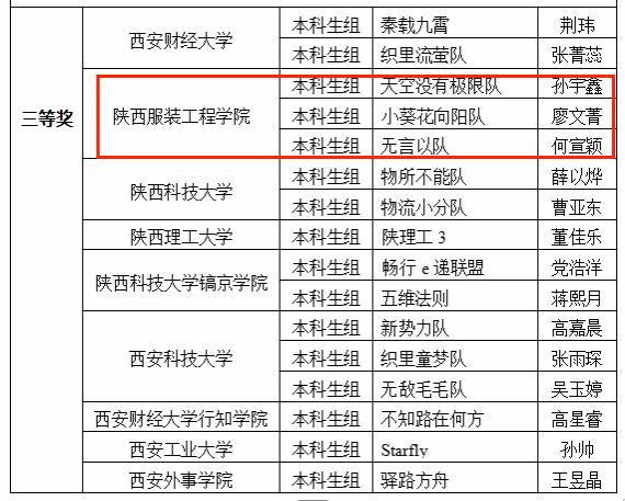 经过院赛、校赛线下答辩,省赛专家网络评选等环节层层选拔,我院3支团队在“新青年吴兴杯”第九届全国大学生物流设计大赛陕西省赛中荣获“三等奖”。