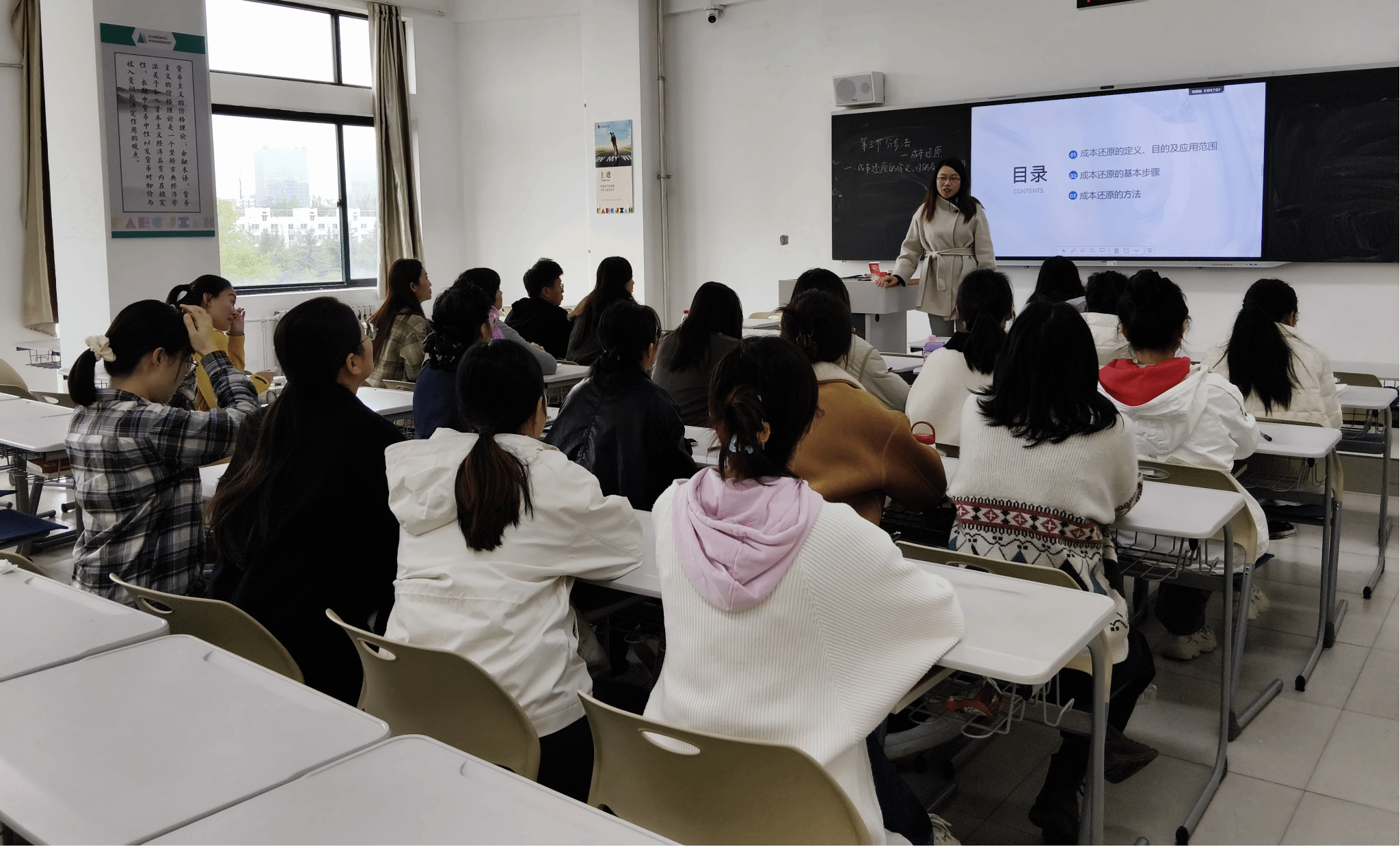 在知识讲解环节,张秀华始终以靓彩服装企业案例为核心,围绕“什么是成本还原、为什么要还原、如何还原”三个核心问题展开。针对 “为什么还原”,教师将产成品中的 “半成品” 比作 “混合物”,指出其包含上一步骤的直接材料、人工与制造费用,并非“纯净” 的成本项目,因此需通过还原产品原始成本构成。在讲解“如何还原” 时,张秀华结合黑板推演与 PPT 图表,一步步演示成本还原计算过程,每一步都强调 “成本会计需严谨细致,一个小数点错误可能导致分析偏差”,潜移默化培养学生职业素养。同时,张老师结合华为、小米等企业的成本管理案例,将课程内容与“精益生产”“质量强国”等理念相结合,实现了知识传授与价值引领的有机统一。