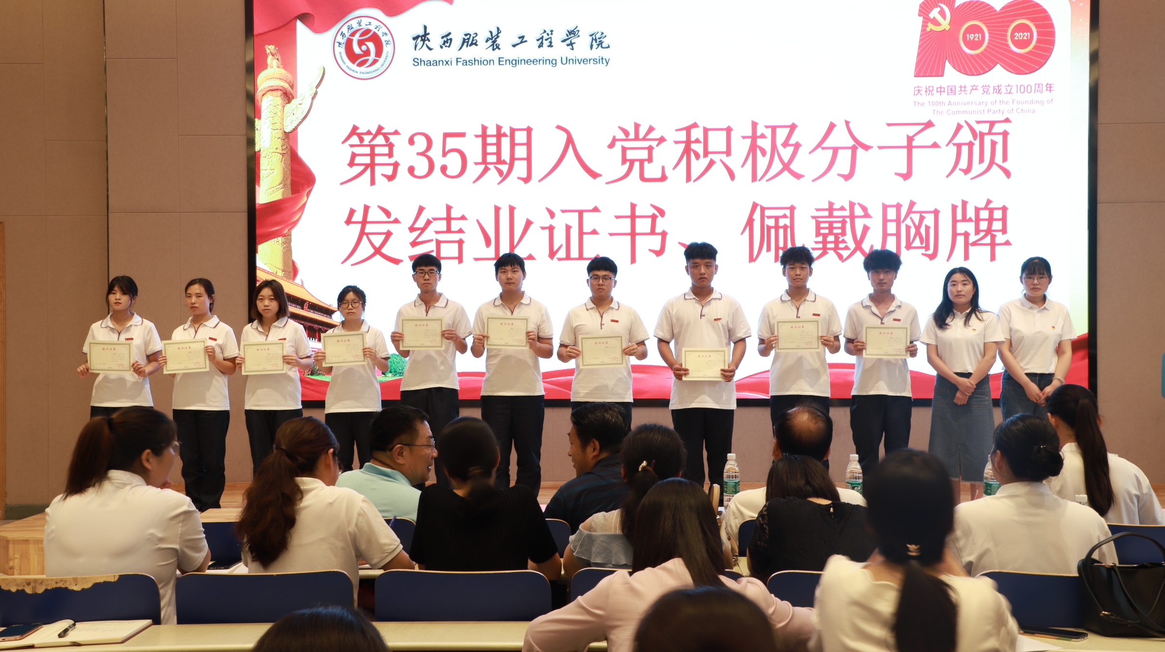 学生第二支部书记亓沙沙、副书记陈甜为85名第35期入党积极分子颁发结业证书、佩戴入党积极分子胸牌。