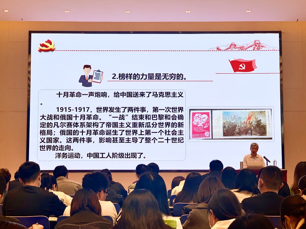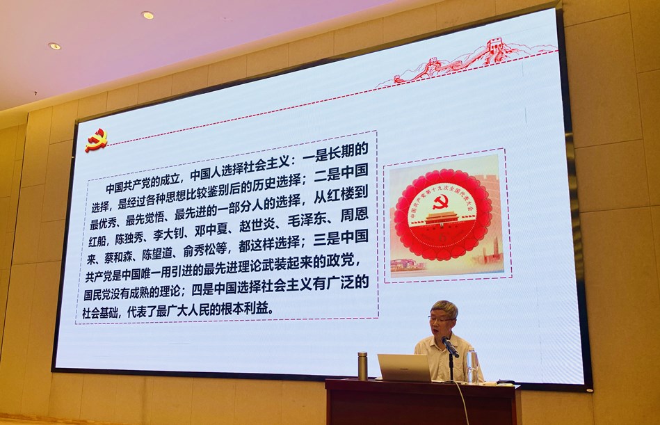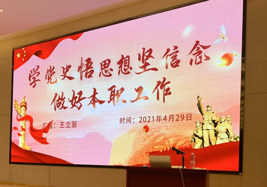 王立新教授作了《学党史 悟思想 坚信念 做好本职工作》的主题报告。王教授从为什么要学党史、中国为什么会诞生共产党、党史学习教育要务求实效三个问题展开,以详实的历史、文献资料,深入浅出地讲述党史。