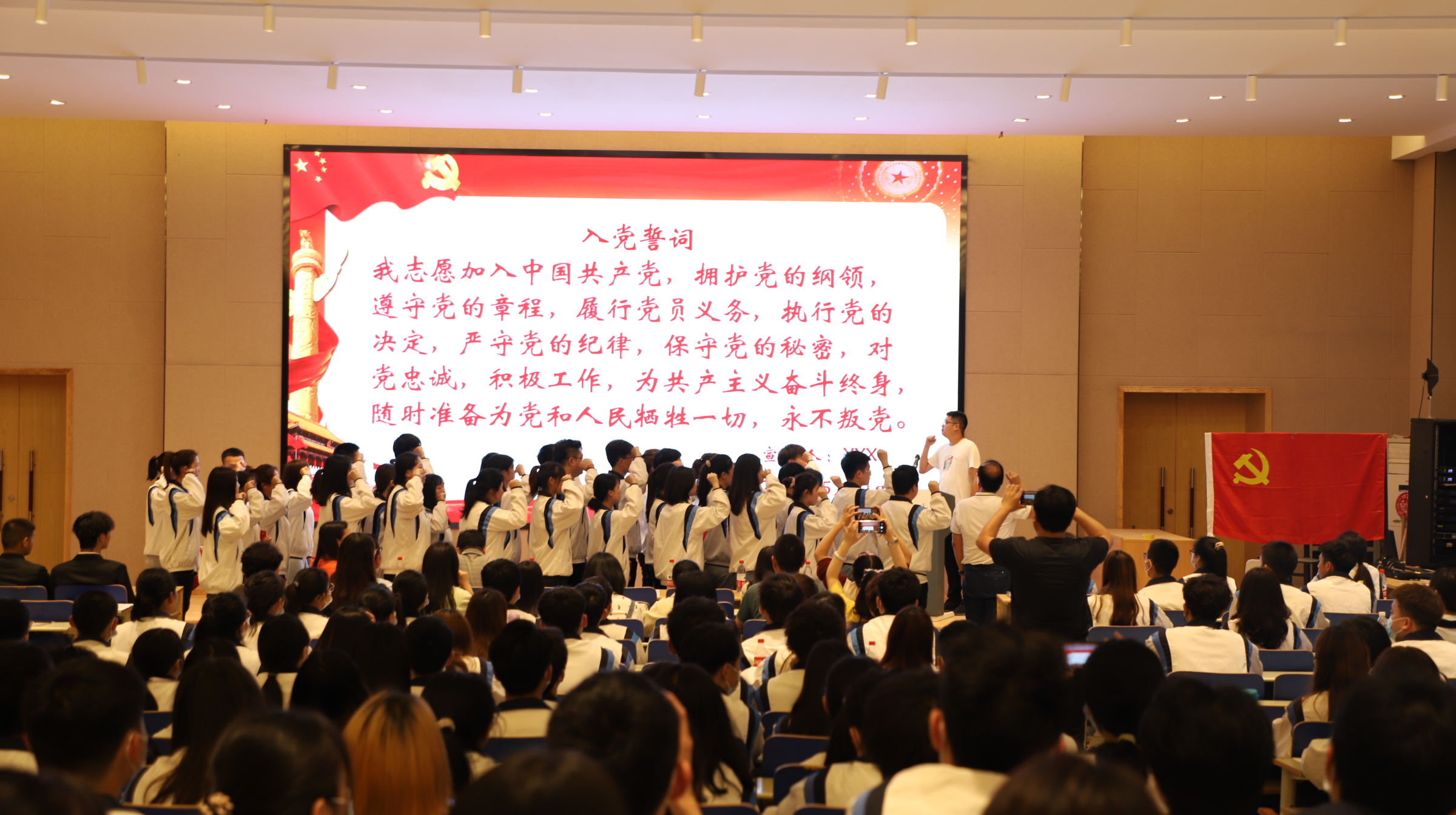 会议在奏唱国歌中开始,党总支委员韦瑞宣读新党员名单,老党员祝欣宇、新党员孟姝、入党积极分子崔新建做了表态发言,校长助理罗文谦与PA视讯集团党总支书记李玉玫、院长杨生博一起为新党员佩戴党徽并为新党员领读誓词。