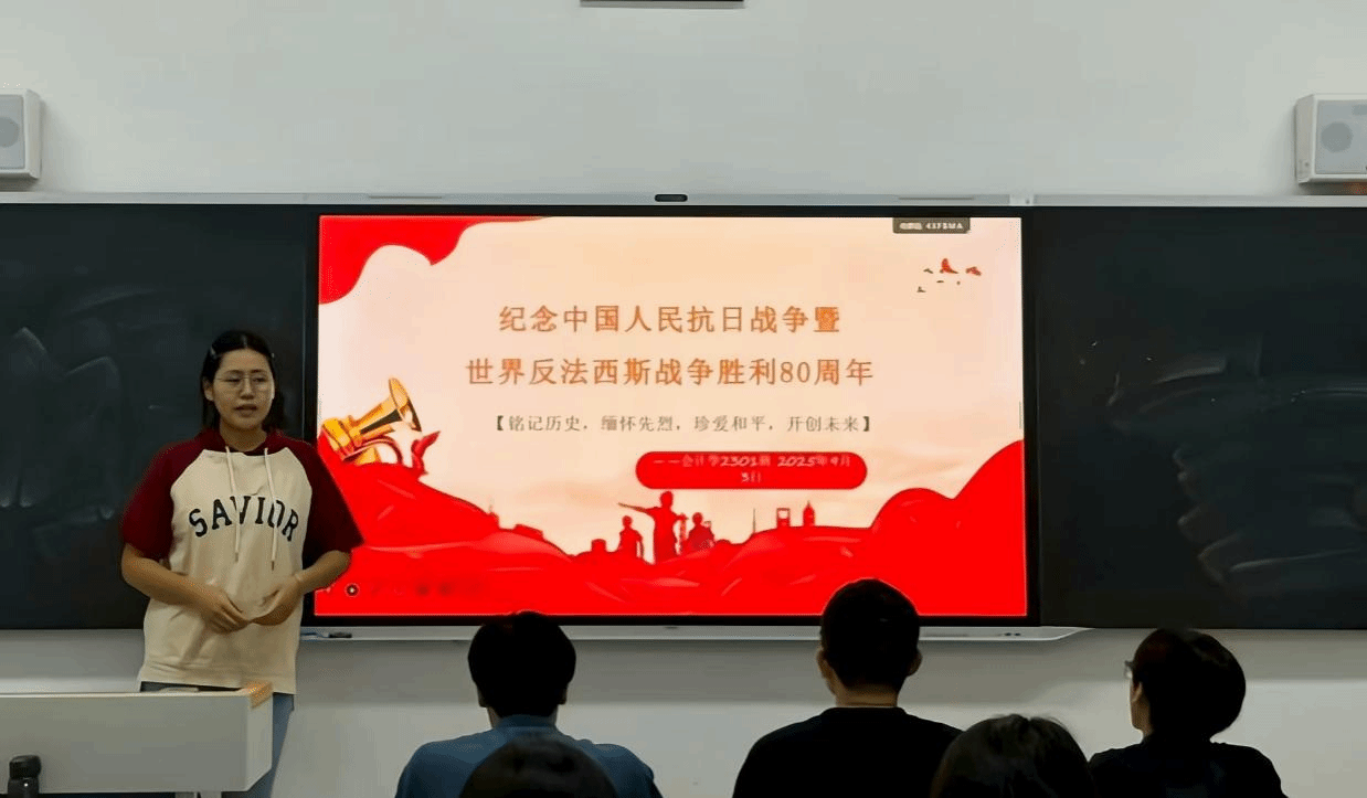 会计学2402班团支部邀请共青团员上台讲解九一八事变、七七事变等重要抗战历史事件,带领大家深入回望那段风雨如晦的岁月,以及中国军民在危难中奋起的英勇抗争事迹。知识竞答环节更是激发了团员们的积极性,大家踊跃参与,在互动中进一步巩固了抗战知识。通过此次主题团课,团员们深刻认识到和平来之不易,纷纷表示要铭记历史,传承和弘扬伟大的抗战精神,为实现中华民族伟大复兴而努力奋斗。