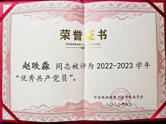 她出生在一个党员模范家庭里,在爷爷与父亲的言传身教和日常熏陶下,她从小就对中国共产党充满着憧憬与向往,能成为一名光荣的共产党员一直是她心中的追求。因此,她在大一刚入学时,便向党组织递交了入党申请书,通过不懈地努力,现已成为一名正式党员。她时刻保持与时俱进,认真学习党的二十大知识,于今年七一建党节被评为“优秀共产党员”。