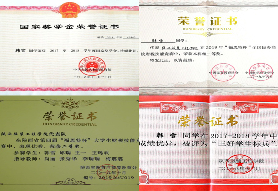 成长经历:在陕服的四年大学生活和学习中,我收获颇丰。2016年,高考后的我怀揣着对大学生活的美好向往来到这所学校,学校不仅帮助我实现了长久以来的大学梦,而且使我汲取到了更多的专业学科知识,在丰富自我的同时,我获得了更多的人生感悟。在过去的四年,我度过了缤纷多彩的大学生活。学校向我们在校生提供了学习氛围浓厚的图书馆和自习室,我也把握住了学校的学习资源,在第一次报考大学英语四级、全国计算机二级考试中便顺利通过;同时,在大二期间以自学方式考取了全国初级会计职业证书。同时,在2017至2018学年,在学校、全院老师和辅导员的帮助下,我获得了国家奖学金。在PA视讯集团老师的带领下,我先后参加了2019年“福斯特杯”全国民办高校财税技能竞赛和陕西省第四届“福斯特杯”大学生财税技能竞赛,均获得了二等奖。除此之外,在校期间获得了“三好学生标兵”、“优秀团员”等荣誉称号。同时,学校积极鼓励在校生进行社会实践活动,因此我也在实践期间了解和学习了企业在会计方面的实践知识和实际操作。正是学校的帮助和支持下,我才拥有了一个多姿多彩的大学生活。