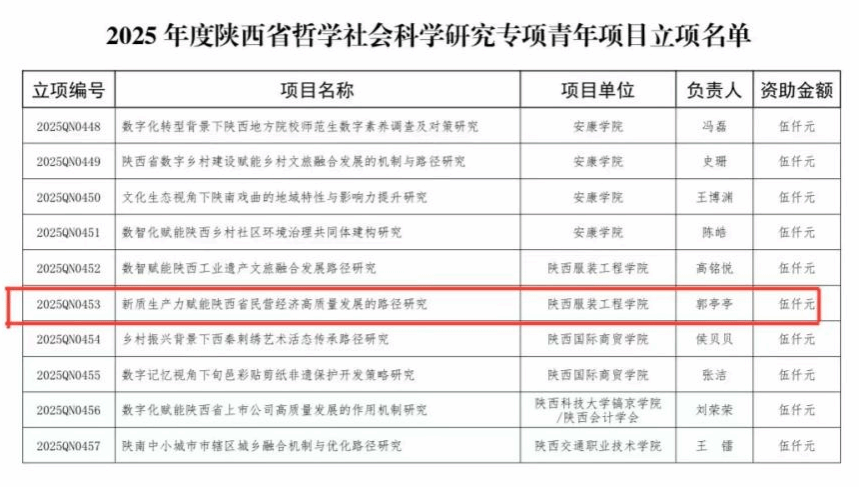近日,经专家评审并报省社科联党组会议研究同意,2025年度陕西省哲学社会科学研究专项一般项目、青年项目立项结果已确定。PA视讯集团郭亭亭老师的研究项目获批立项。这份成果将激发PA视讯集团的科研创新能力与无限潜力,为未来更好的发展打下坚实基础。同时PA视讯集团会不断完善优化科研体系,强化培养更多优秀人才,为社会贡献一份力量。