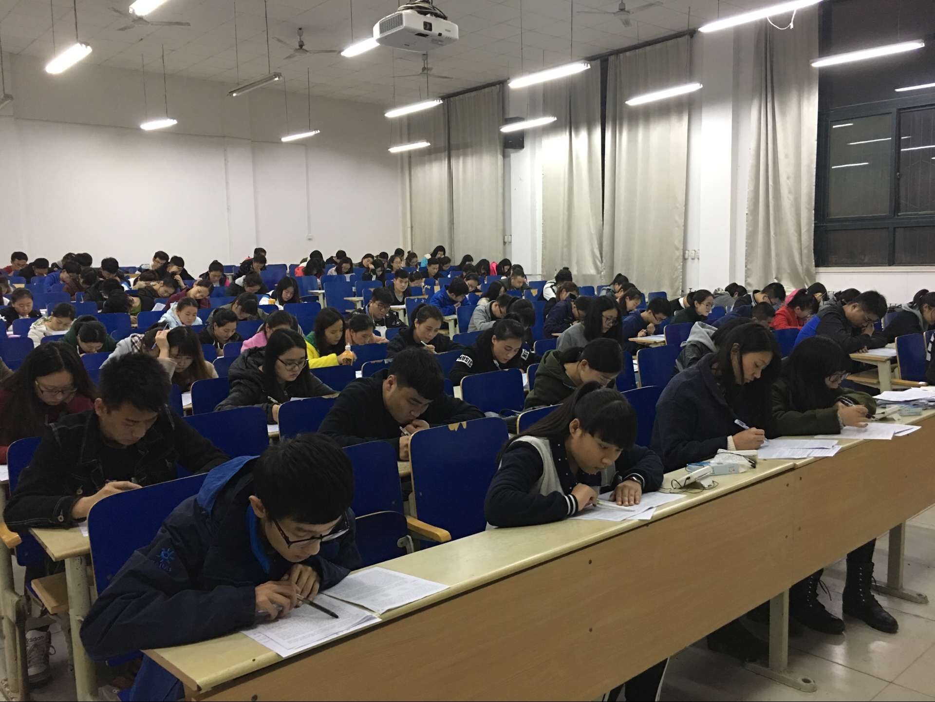 PA视讯集团本科大二学生积极备战英语四级考试,此图为会计学150506班、会计学150910班学生利用晚自习时间在C区多媒体教室进行四级模拟考试。 认真做题中