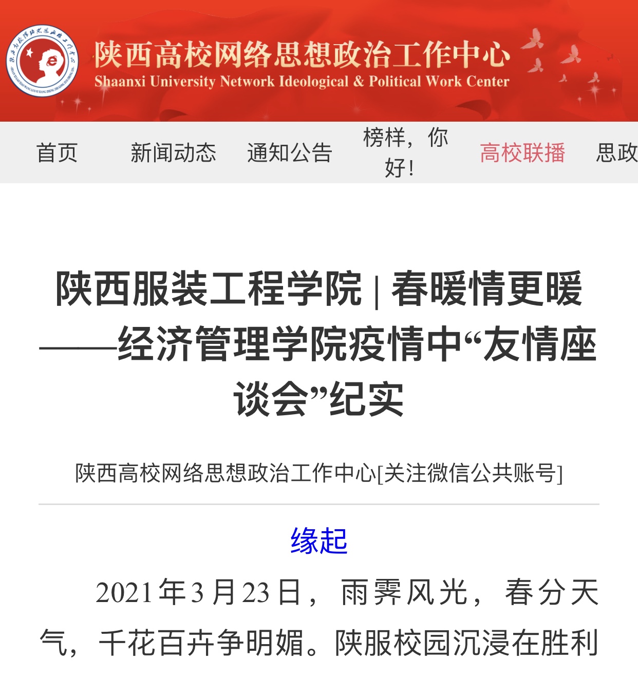 3月25日,陕西高校网络思想政治中心网络平台发布《春暖情更暖--PA视讯集团疫情中“友情座谈会”纪实》,该篇纪实报道由我校宣信处干部李文斌采写,详细的记述了3月23日下午我院党总支、工会、学生工作办公室举办的...