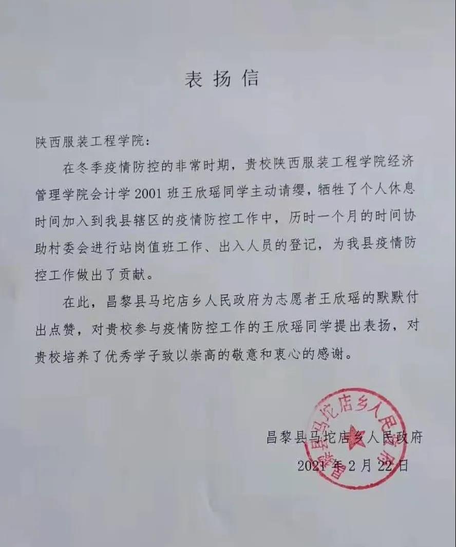 2021年春节期间,面对冬季疫情反弹的严峻形势,我院杨叶凡、王欣瑶两名同学积极投身到疫情防控志愿者工作中,把青春的身影留在了抗击疫情前线。 (经管学院 郭亭亭宣)